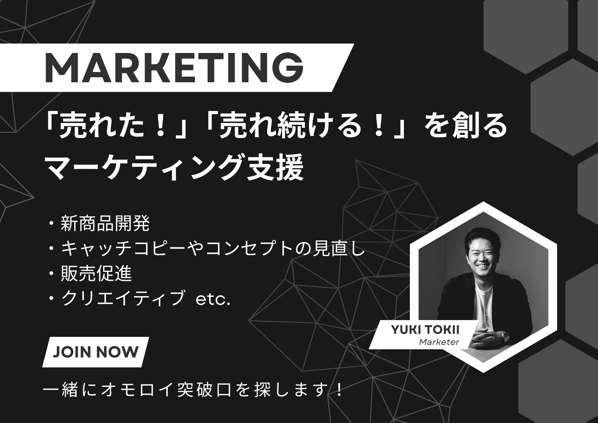 ヒット商品の企画、想いが伝わるコピーライティング、印象に残るネーミング、お客様を引き寄せる売り場づくり、売上を生む接客技術や販促物など「売れる」につながるご提案をします。